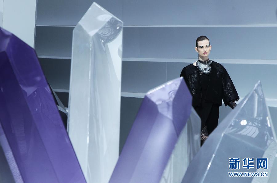 3月6日,模特在法國巴黎時裝周上展示香奈兒2012/2013秋冬新品。當日,香奈兒總設計師卡爾·拉基菲爾德將法國巴黎大皇宮裝扮成“水晶巖洞”,上百根大小不同、顏色各異的水晶柱形狀飾品以各種形態豎立在伸展臺上,模特身著以“水晶概念”為主題的香奈兒最新春裝,穿梭在“水晶”世界中。新華社記者高靜攝