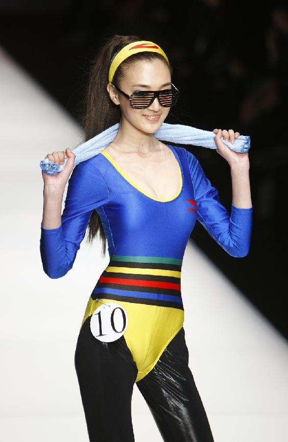 3月29日,模特在展示參賽作品。當日,“浩沙杯”首屆中國健身服飾設計大賽在北京舉行。 新華社發(萬象 攝)