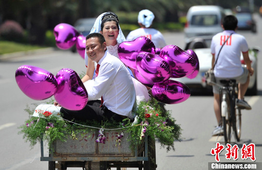 5月12日,云南省蒙自市的一名80后年輕人,用1輛三輪車和8輛“二八”自行車組成的個性迎親車隊,接回了自己的漂亮新娘。中新社發 劉冉陽 攝