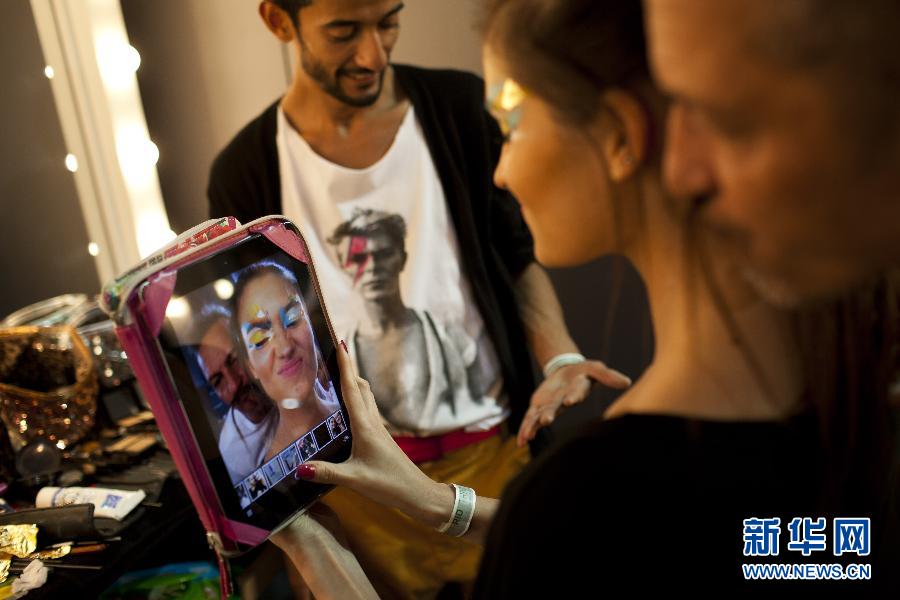 5月26日,在巴西里約時裝周上,一名模特化妝完畢后自拍。 新華社/美聯