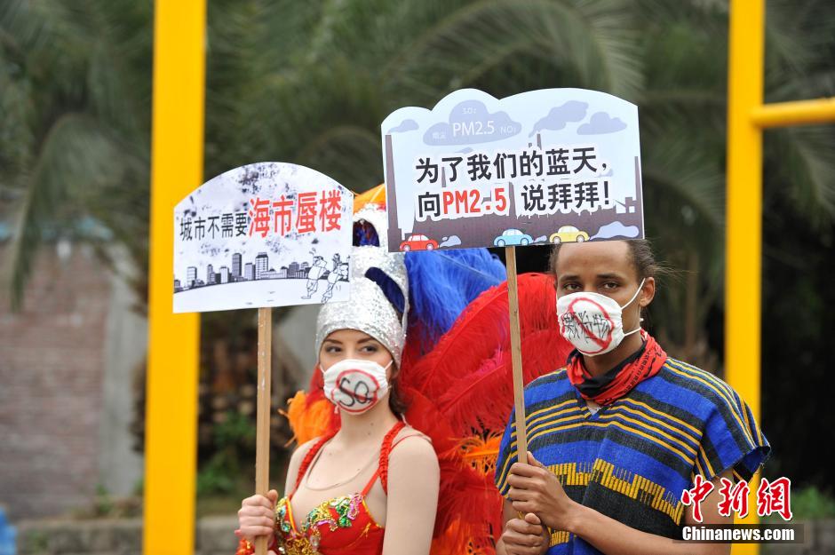 2月28日,重慶洋人街上不少工作人員戴著口罩,舉著阻擊霧霾的各種標(biāo)語(yǔ)等行為藝術(shù),宣傳防治大氣污染、環(huán)境保護(hù)。洋人街工作人員以行為藝術(shù)的方式向游客展示人、動(dòng)物在親近自然的同時(shí)面帶防毒面具,口罩等夸張的藝術(shù)表現(xiàn)形式,喚醒人們的環(huán)保意識(shí)。圖為洋人街工作人員行為藝術(shù)宣傳環(huán)保。鐘欣 攝