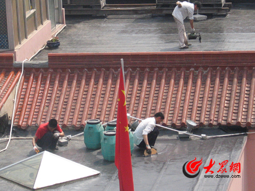 國旗下的勞動者:5月1日,在濟南泉城廣場旁的一座建筑頂上,三名工人正在涂刷防熱膜,與旁邊鮮艷的國旗構成一道靚麗的風景。