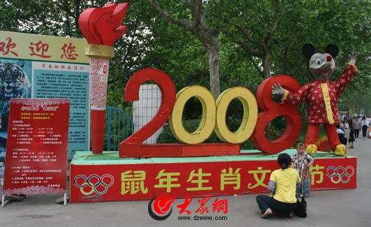 一位母親在奧運火炬造型前給孩子拍照留念