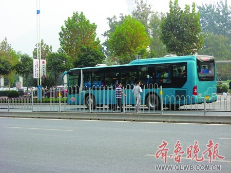 繼濼源大街銀座橋附近護欄加高后,近日,在經十路泉城公園北門,四段隔離護欄也被“試驗性”加高。不過,與銀座橋附近護欄“補高”不同,經十路上出現的護欄加高,是拆舊護欄換新高度的護欄,可謂“整體增高”。 記者 趙恩霆 攝