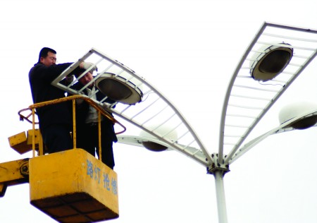 3月23日,臨沂市政部門的工作人員正在修復(fù)臨沂市火車站廣場內(nèi)的路燈線路。據(jù)了解,為爭創(chuàng)國家園林城市,臨沂市政部門近期組織維修人員對市區(qū)內(nèi)逐條街道路燈進(jìn)行檢修,確保城市亮燈率。記者 寇潤濤 攝