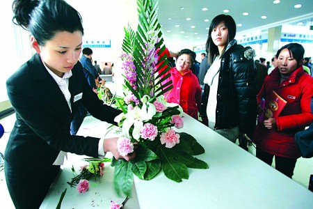 27日上午,在人力資源市場舉辦的“民營企業招聘周”上記者看到,為了幫助求職者開拓創業思路,勞動就業部門專門邀請了幾家創業型企業,在現場展示育嬰護理、插花等各類技能。