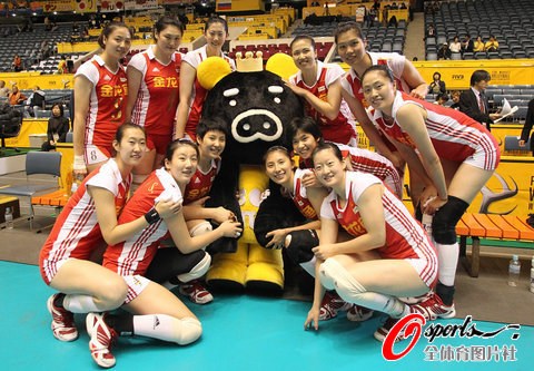 北京時間11月9日,2010年女排世錦賽復賽階段第三輪較量在休賽一天之后陸續展開,積分榜上目前僅1勝4負的中國女排3-0完勝波蘭隊,保留晉級八強希望。圖為中國姑娘與勝利小豬合影。