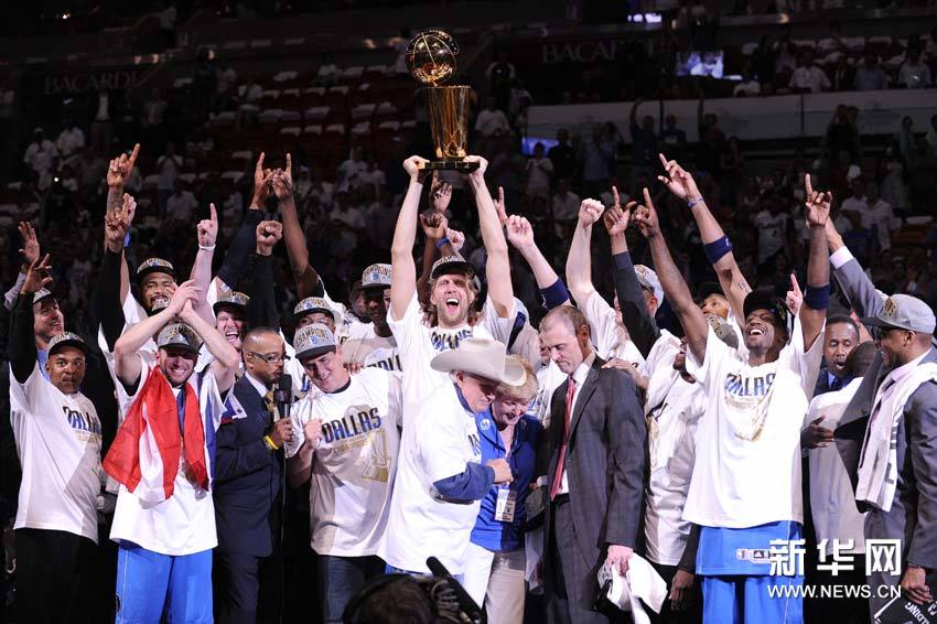 NBA總決賽:小牛隊(duì)首奪總冠軍 6月12日,小牛隊(duì)球員諾維茨基(中)手捧獎(jiǎng)杯與球隊(duì)成員們慶祝。當(dāng)日,在NBA總決賽第六場中,達(dá)拉斯小牛隊(duì)客場以105比95戰(zhàn)勝邁阿密熱火隊(duì),從而以4比2的總比分在NBA總冠軍榜上第一次寫上了小牛隊(duì)的名字。新華社記者張軍攝