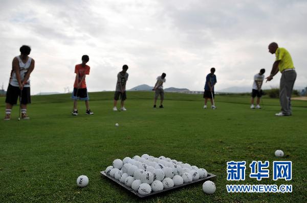 7月14日,一名老師在教學生高爾夫球基本技術。暑假期間,澳門特區體育發展局推出高爾夫球班,吸引眾多澳門學生參加學習。新華社記者張金加攝