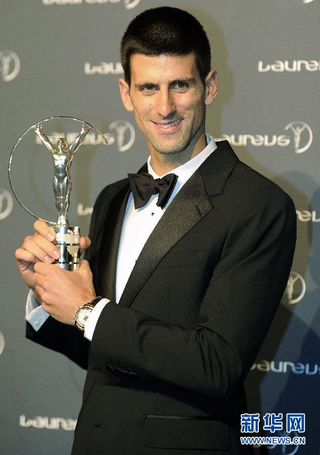 2月6日,塞爾維亞網球名將焦科維奇與獎杯合影。當日,2012年勞倫斯世界體育獎揭曉,焦科維奇首次獲得“最佳男運動員”稱號。新華社/路透