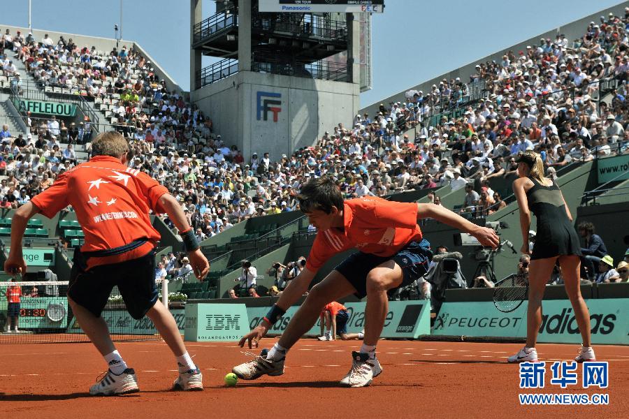 5月29日,在法國網球公開賽比賽中,球童們在俄羅斯選手莎拉波娃旁撿球。