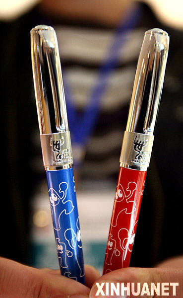 這是為上海世博會推出的海寶紀(jì)念款鋼筆(3月24日攝)。3月24日,2010年上海世博會特許商品供需對接會在上海世貿(mào)商城開幕,一批將中國傳統(tǒng)文化、海派文化與世博元素進(jìn)行創(chuàng)意結(jié)合的上海世博會特許商品新品亮相展會。新華社記者劉穎攝
