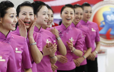 當(dāng)日,“第五屆空姐新人秀——中國新空姐招募大匯之亞運(yùn)空姐總決賽”首站選拔賽在武漢開賽,吸引了全國各地近萬名選手報名參賽。南航2010年在全國共設(shè)置10個選區(qū),計劃招收1000名乘務(wù)員,還將經(jīng)過層層選拔,挑選其中的精英在亞運(yùn)精品航班上為各個國家和地區(qū)的運(yùn)動員、官員和來賓服務(wù)。新華社記者程敏攝