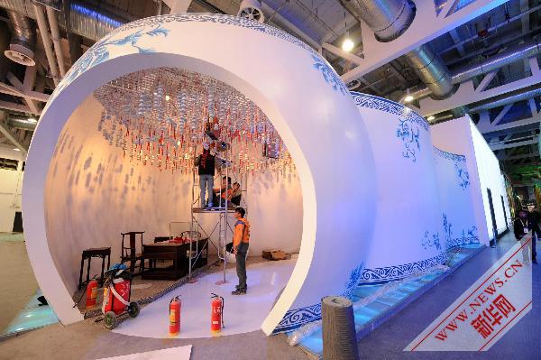 4月15日,在設(shè)計(jì)成青花瓷器造型的江西館內(nèi),工人忙著安裝瓷器掛飾。