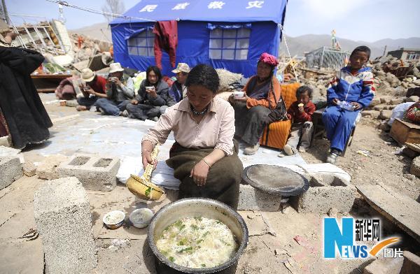 4月18日,在玉樹縣結(jié)古鎮(zhèn),受災(zāi)群眾在吃午餐。當(dāng)日,青海省玉樹地震發(fā)生后第五天,在臨時(shí)居住點(diǎn)暫時(shí)安頓下來的受災(zāi)群眾,在廢墟旁生火做飯,晾曬牛肉,災(zāi)后生活正在逐步展開。 新華社記者 江宏景 攝