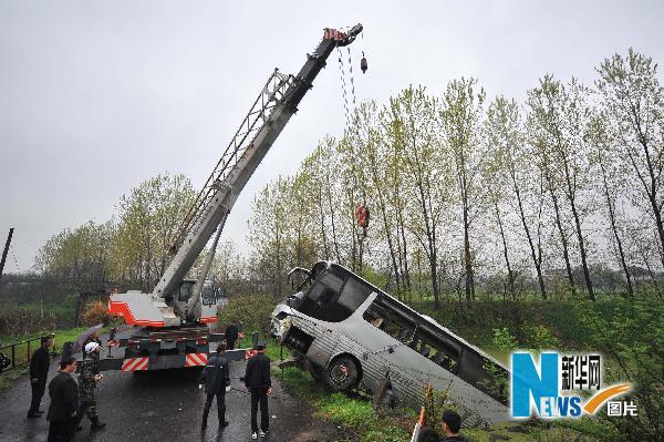 4月19日,救援人員在事故現場打撈沖入河中的大客車。當日10時30分左右,一輛載有24人的安徽籍大客車行至寧通高速公路江蘇揚州蔣王收費站附近時,由于雨天路滑、車速過快,客車失控沖進路旁河中,造成1人死亡,多人受傷。事故發生后,揚州公安、消防、衛生等部門迅速啟動應急預案,趕赴現場救援。新華社發