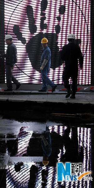 4月19日,幾名工人從法國館外的電子顯示屏前經(jīng)過。