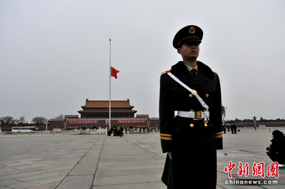 4月21日早晨,北京天安門廣場下半旗為玉樹地震遇難者志哀。中新網記者 金碩 攝 升旗儀式在清晨5:30左右進行,國旗升上旗桿頂部后,再向下降至半旗。 為表達全國各族人民對青海玉樹地震遇難同胞的深切哀悼,中國國務院決定,今日舉行全國哀悼活動,全國和駐外使領館下半旗志哀,停止公共娛樂活動。