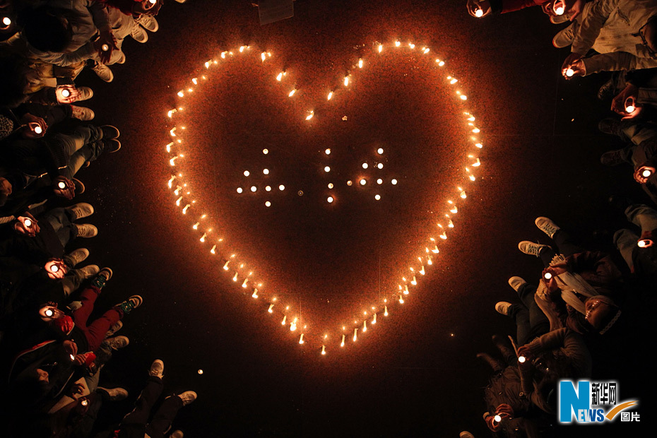 4月20日晚,江蘇省南通大學學生在“玉樹,我們一直在”祈福活動中點亮蠟燭,哀悼逝者。 新華社發(許叢軍 攝)