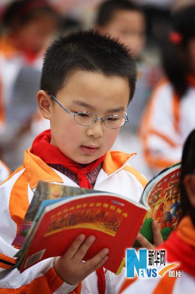 4月22日,安徽省淮北市第二實驗小學的學生誦讀經典課本。