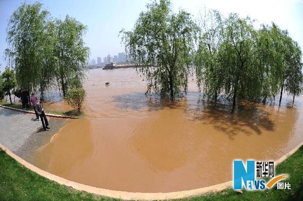 4月23日,長沙橘子洲上幾位游客在被江水淹沒的游道邊觀看湘江。