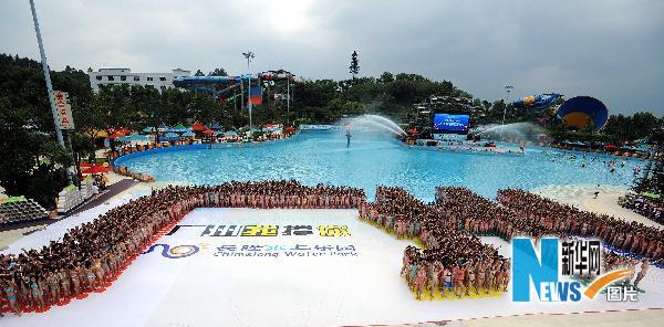 5月9日,1940名身著比基尼的女士組成“廣州”漢字圖形。當日,為表達廣州市民對2010年廣州亞運會的支持,長隆水上樂園舉辦了由1940名女士參加的“廣州我撐你”漢字比基尼造型活動,刷新了去年在這里創造的1290人的吉尼斯世界紀錄。新華社記者劉大偉攝
