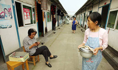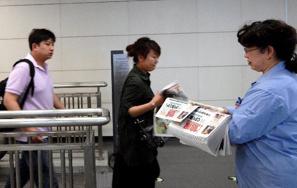 5月12日,地鐵10號線團結湖站樓梯口,乘客領取免費報紙。