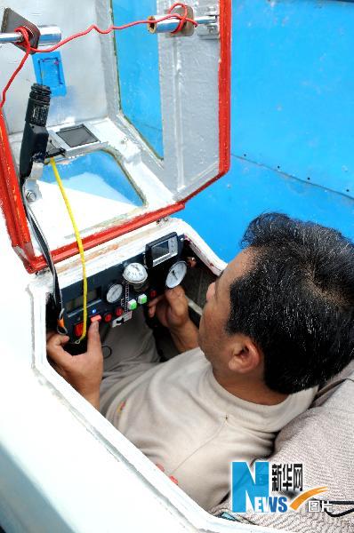 當天,柳州市民高先生對自己打造的“仿魚潛艇”進行試潛,取得一定成功,但由于電路等方面的原因未能完全潛入水中推進。據介紹,這艘“仿魚潛艇”長3.8米,利用水箱和升降舵來控制沉浮,電動機帶動艇尾擺動推進,并安裝了救生、氣體過濾、通訊等系統。2009年11月29日,高先生曾在柳江中試潛失敗。 新華社發(賴柳生 攝)