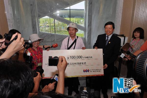 5月25日,第十萬名游客劉云祥(中)高興地接受記者采訪。當日,位于世博園區A區的上海世博會臺灣館迎來第十萬名游客——來自湖南省委老干部局的劉云祥。他獲得了一臺價值1萬多元的52英寸液晶電視。新華社記者何俊昌攝
