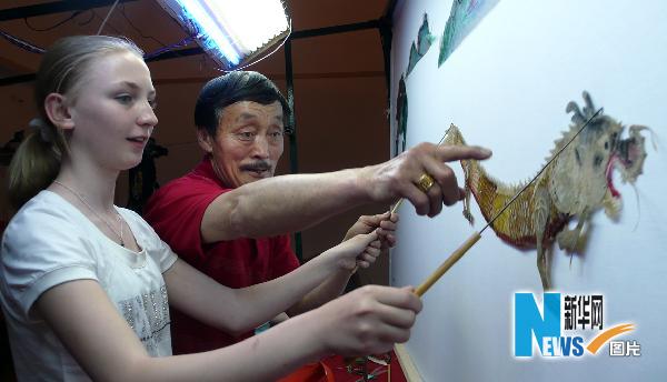 5月26日,俄羅斯兒童在大連賞槐會“民族風(fēng)情周”活動(dòng)中體驗(yàn)“皮影戲”。當(dāng)日,第21屆大連賞槐會“民族風(fēng)情周”活動(dòng)在南山風(fēng)情一條街舉行。大連復(fù)州城民間藝人表演的傳統(tǒng)皮影戲受到中外游客的喜愛,俄羅斯兒童到后臺向老藝人們學(xué)起了“皮影戲”。新華社發(fā)(盧國忠 攝)