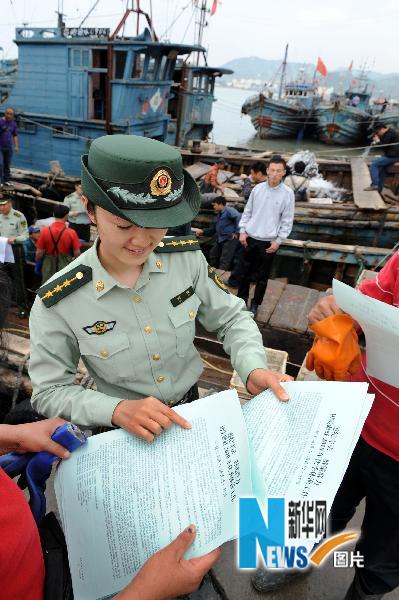 5月31日,青島沙子口邊防派出所警官劉婕向漁民發(fā)放伏季休漁通知。根據(jù)農(nóng)業(yè)部的部署,從6月1日中午12時起,北緯35度以北的黃海和渤海海域?qū)⑦M入為期三個月的伏季休漁期。目前,山東沿海4.4萬余艘應(yīng)休漁漁船陸續(xù)按期返港,各漁港正在按“船進港、網(wǎng)入庫、人上岸、證集中”的休漁要求加強海陸監(jiān)管,做好重點區(qū)域、重點時段和重點對象的管理,切實維護好伏季休漁秩序。新華社記者 李紫恒攝