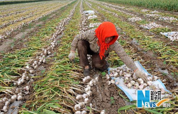 6月1日,山東省金鄉縣一位蒜農在收獲大蒜。