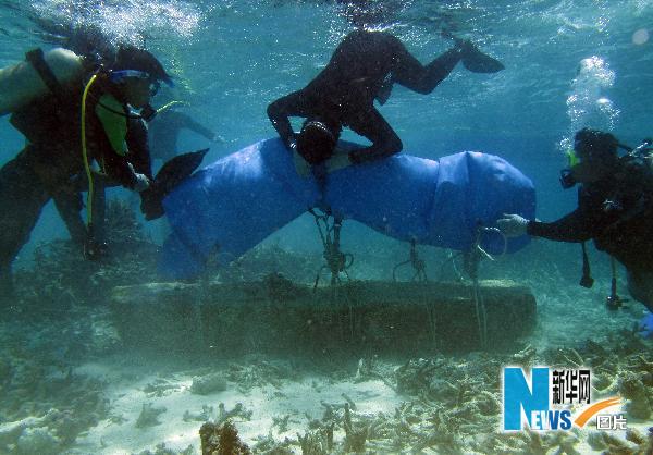 記者6月1日從2010年南海水下考古新聞發(fā)布會獲悉,經(jīng)過35天海下作業(yè),水下考古隊在中國南海西沙群島附近海域新發(fā)現(xiàn)水下文化遺存32處,并首次在南海海域發(fā)現(xiàn)元代青花瓷器。新華社記者郭程攝