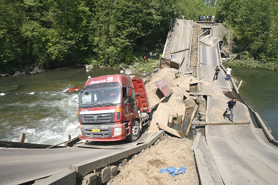 2010年6月8日20時30分許,吉林省道302朝長公路194公里+100米處的錦江大橋突然垮塌,一輛行駛在橋上的大掛貨車連同橋面墜入錦江,一輛出租車駛到垮塌大橋處時墜入橋下,貨車與出租車共7人,6人受傷。