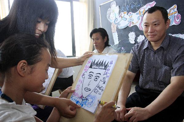 6月17日,一位小學生在老師陳茂英(左上)的指導下為父親畫漫畫。當日,濟南北大槐樹小學的學生邀請父親來到學校,用學習的漫畫技藝為自己的父親創作漫畫,迎接即將到來的“父親節”。 新華社記者 朱崢攝