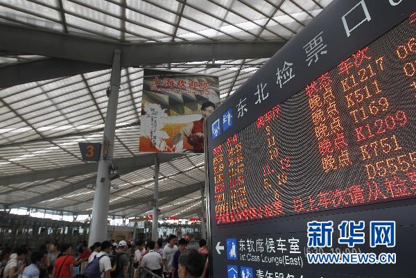6月20日,進站旅客從上海南站的電子公告牌旁經過。當日,受南方暴雨影響,從上海南站發往福州、南昌、貴陽等方向的11趟列車停運,大量列車晚點,近8000名旅客需辦理退票手續,2萬多名旅客出行受阻。為及時疏導客流,上海長途汽車客運南站積極組織運力,加開班次運送鐵路旅客。新華社記者 裴鑫 攝