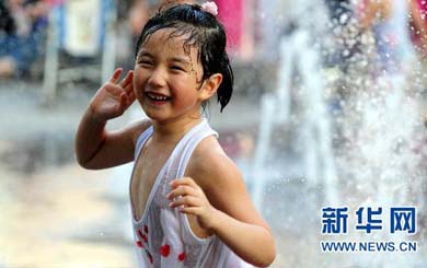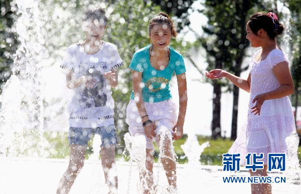 連日來,天津市區的氣溫持續上升,當地氣象部門已將高溫預警升級為橙色。天津大學定時開放的噴泉廣場,成為市民和學生避暑降溫好去處。新華社發(李想 攝)