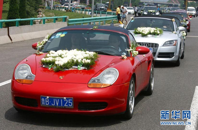 7月7日,山東青島,紅色法拉利引領著由43輛名車組成的豪華婚車隊行進在市區馬路上,引來無數關注。據悉,這是北京的一位富二代在香格里拉酒店舉辦訂婚儀式,新娘是濟南某綜藝電視臺的節目主持人,即墨馬山人。按照青島傳統,男方要給女方訂親錢,這位新郎給了88888888元的訂親錢。另外加上租車、宴席等,男方的花費已經過億。