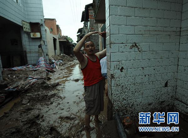 7月9日,一位村民比劃著說:“當(dāng)時(shí)的水比我人還要高。” 當(dāng)日凌晨,位于三峽庫區(qū)的重慶市萬州區(qū)分水鎮(zhèn)開始遭受強(qiáng)降雨襲擊,引發(fā)山洪、泥石流、山體滑坡等自然災(zāi)害。強(qiáng)降雨導(dǎo)致大量農(nóng)田被淹、莊稼被毀,分水場鎮(zhèn)及所轄的三正場鎮(zhèn)被淹,積水深達(dá)1.2米。暴雨導(dǎo)致分水鎮(zhèn)6000多間房屋被淹,600多間房屋倒塌,1.5萬人受災(zāi)并被緊急安全轉(zhuǎn)移,目前暫無人員傷亡報(bào)告。 新華社記者 周衡義 攝