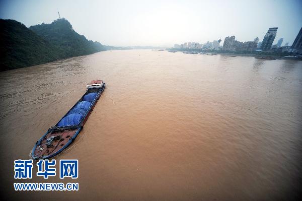 7月11日拍攝的長江宜昌段水位上漲的江面。當日凌晨,今年長江入汛以來的首次洪峰到達三峽大壩。中國長江三峽集團公司實測結果顯示,上午此次洪峰的最大流量達38500立方米/秒,為今年三峽最大入庫流量。新華社發(劉曙松 攝)