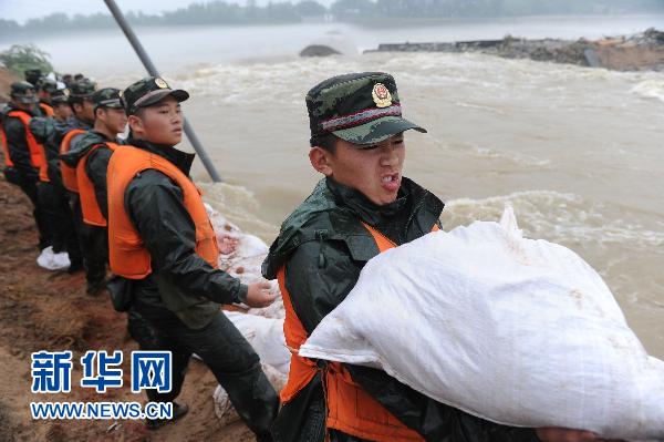 7月12日,武警安慶支隊官兵在青草鎮(zhèn)攔河壩岸堤決口處搬運沙袋加固大堤。 7月11日安徽省安慶桐城市遭受特大暴雨襲擊,長江支流大沙河干堤出現(xiàn)多處坍塌潰破、漫堤潰破、涵閘出險等大小險情,2萬余軍民奮戰(zhàn)潰堤一線。最險處的青草鎮(zhèn)攔河壩岸堤決口近200米,附近群眾生命財產(chǎn)安全受到嚴重威脅。災(zāi)情發(fā)生后,武警安慶市支隊緊急調(diào)集近300名官兵與當(dāng)?shù)厝罕娺B續(xù)奮戰(zhàn)一天一夜,加固大堤、排除險情。目前,險情已得到初步控制,大堤加固工作仍在緊張進行。新華社記者李健攝