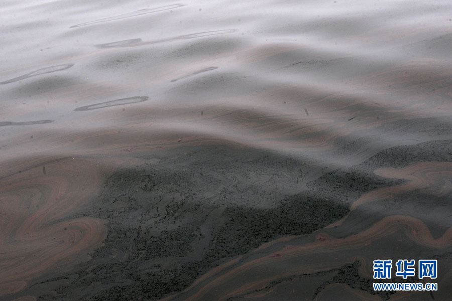 2010年7月17日 大連全面展開海上清污 大連新港輸油管道爆炸后海面上大片的油污(7月17日攝)。大連新港輸油管線爆炸起火事故,至少已造成附近海域50平方公里的海面污染,海上清污工作17日全面展開。截至17日17時,遼寧海事局近百名海事工作人員已經(jīng)在溢油水域布設(shè)圍油欄約7000米。由海事部門組織的近20艘清污船舶,正在對海上的油污開展清除作業(yè),包括遼寧海事局的海巡028、海巡021等四艘巡邏船,一直在事發(fā)水域監(jiān)控油污和布設(shè)圍油欄。新華社記者 任勇攝