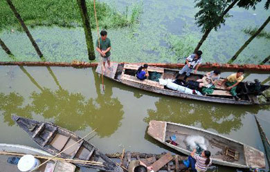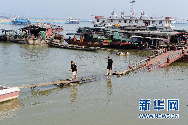 洞庭湖畔岳陽漁港碼頭船只的上岸跳板因水位上漲而加長(7月23日攝)。受近期強降雨和長江高水位頂托影響,湖南洞庭湖區水位超警戒。據湖南省水利廳信息中心監測數據顯示,截至7月23日13時,洞庭湖城陵磯水位已漲至32.91米,高于32.5米的警戒水位。目前,當地防汛部門正加強堤防巡查值守,確保防洪安全。新華社記者 龍弘濤 攝