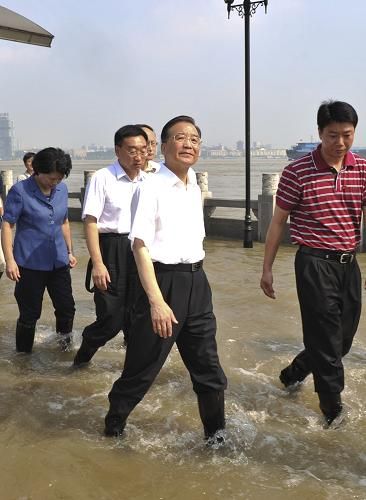 在防汛抗洪的關(guān)鍵時(shí)期,溫家寶于23日來到湖北武漢檢查指導(dǎo)防汛抗洪工作。下午3時(shí)許,他一下飛機(jī)就來到漢口龍王廟險(xiǎn)段實(shí)地察看汛情。這里位于長江和漢江交匯處,河道狹窄,水流湍急,是長江著名險(xiǎn)段之一,也是武漢防洪的心腹之患。1998年大水后進(jìn)行了大規(guī)模的綜合整治,防洪能力大大提高。防洪墻外的觀江平臺已被江水淹沒。溫家寶趟著一尺深的江水,考察了龍王廟綜合整治區(qū)。“現(xiàn)在長江武漢段的水位是多少?”他關(guān)切地問道。“27.13米。這是入汛以來的最高水位。”當(dāng)?shù)刎?fù)責(zé)人回答道。“流量呢?”“每秒51200立方米。”從雨情到水情,從汛情到災(zāi)情,從防汛抗洪到群眾生活安排,溫家寶問得十分細(xì)致。當(dāng)聽到長江上游和漢江上游最近又降暴雨水勢正在上漲時(shí),溫家寶叮囑道,要再接再厲,充分準(zhǔn)備,迎接新一輪洪水的考驗(yàn)。