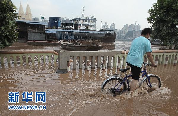 7月27日,在重慶市渝中區濱江路,一位市民在洪水中騎自行車。當日,由于長江水位不斷上漲,重慶部分臨江地區在清理完淤泥后,再次被上漲的洪水淹沒。 新華社記者 陳誠 攝