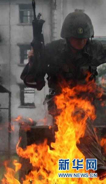 7月28日,一名接受訓練的士兵跨越火障。新華社發(林山杰 攝)
