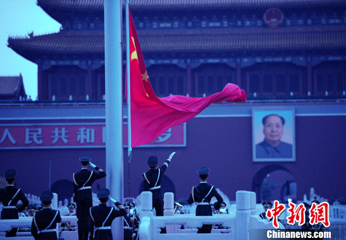 2010年8月1日清晨,國旗護衛隊在北京天安門廣場舉行有軍樂隊現場演奏的隆重升旗儀式,迎接第83個“建軍節”。中新社發 侯宇 攝
