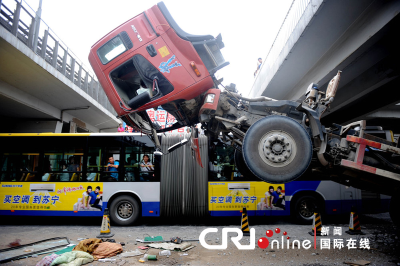 北京大貨車翻斗卡天橋車頭懸空 3人受傷 2010-08-03 16:56