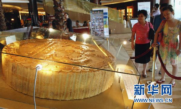 當日,在廣西南寧舉行的2010中秋月餅現場品購會上,一塊直徑1.8米、重1000公斤的“月餅王”吸引了眾多市民的目光。據悉,這塊月餅是南寧市一家大酒店的6名廚師歷經30天純手工打造的。新華社發