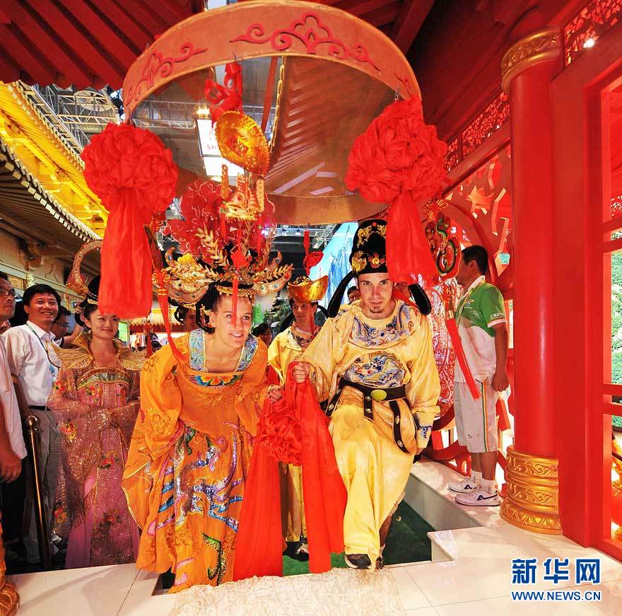 8月14日,在上海世博會陜西館,外國游客在體驗“大唐婚典”。當日,上海世博會陜西館為迎接我國傳統(tǒng)節(jié)日“七夕節(jié)”而舉辦的“華清池中華情人節(jié)系列活動”開幕。兩對外國游客現(xiàn)場體驗了“大唐婚典”,感受中國情人節(jié)的浪漫。新華社記者 丁海濤攝